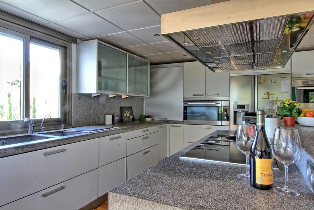 - cocina con cocina de inducción, horno eléctrico, microondas, lavavajillas, frigorífico, congelador, máquina de hielo, cafetera y tostador